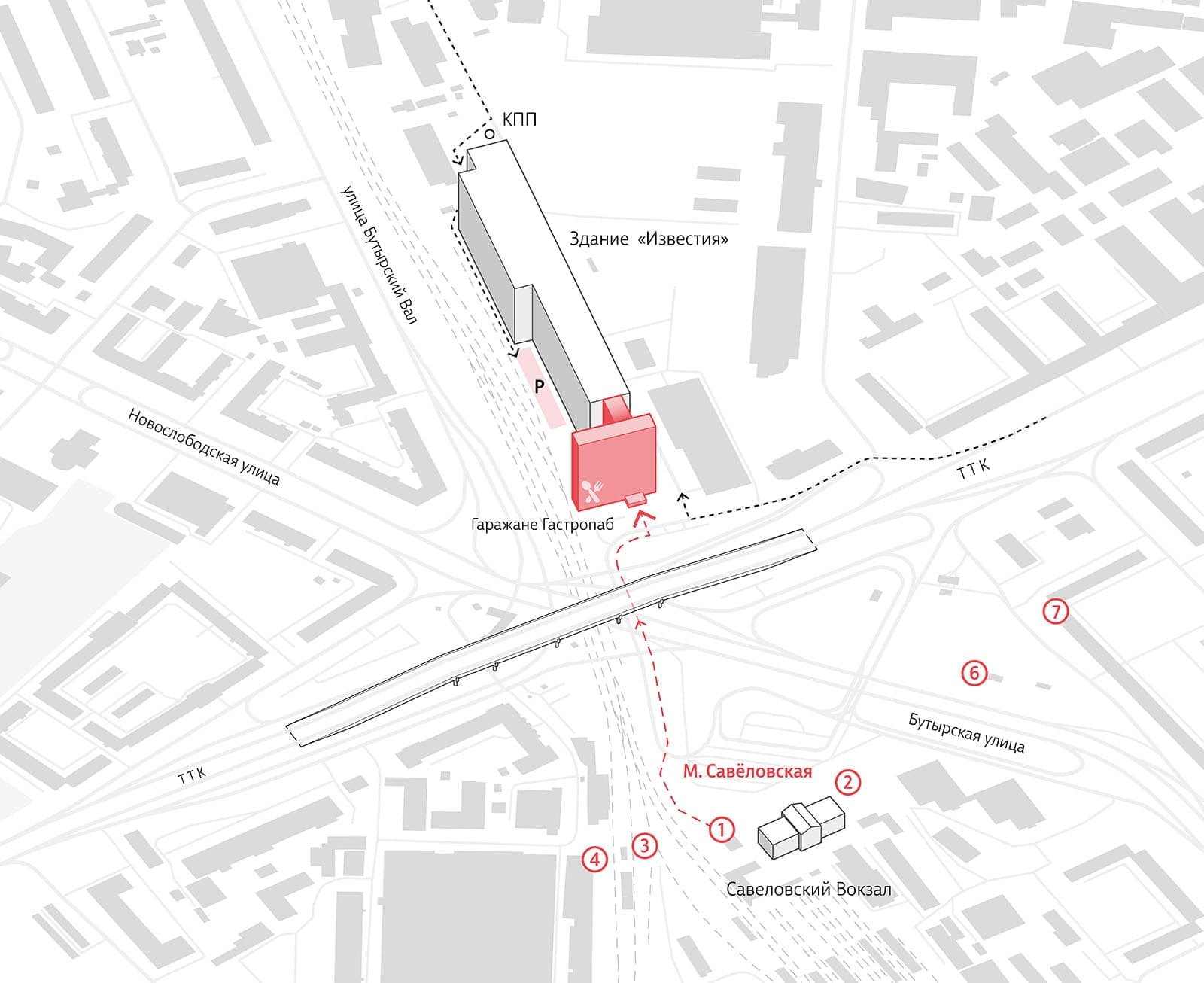 От м. Савёловская – пешком (5 минут). Выход № 1, держаться тротуара слева вдоль ЖД путей, пройти под эстакадой к 9-ти этажной башне "Известия", ориентир - гастропаб "Гаражане". Главный вход через проходную.