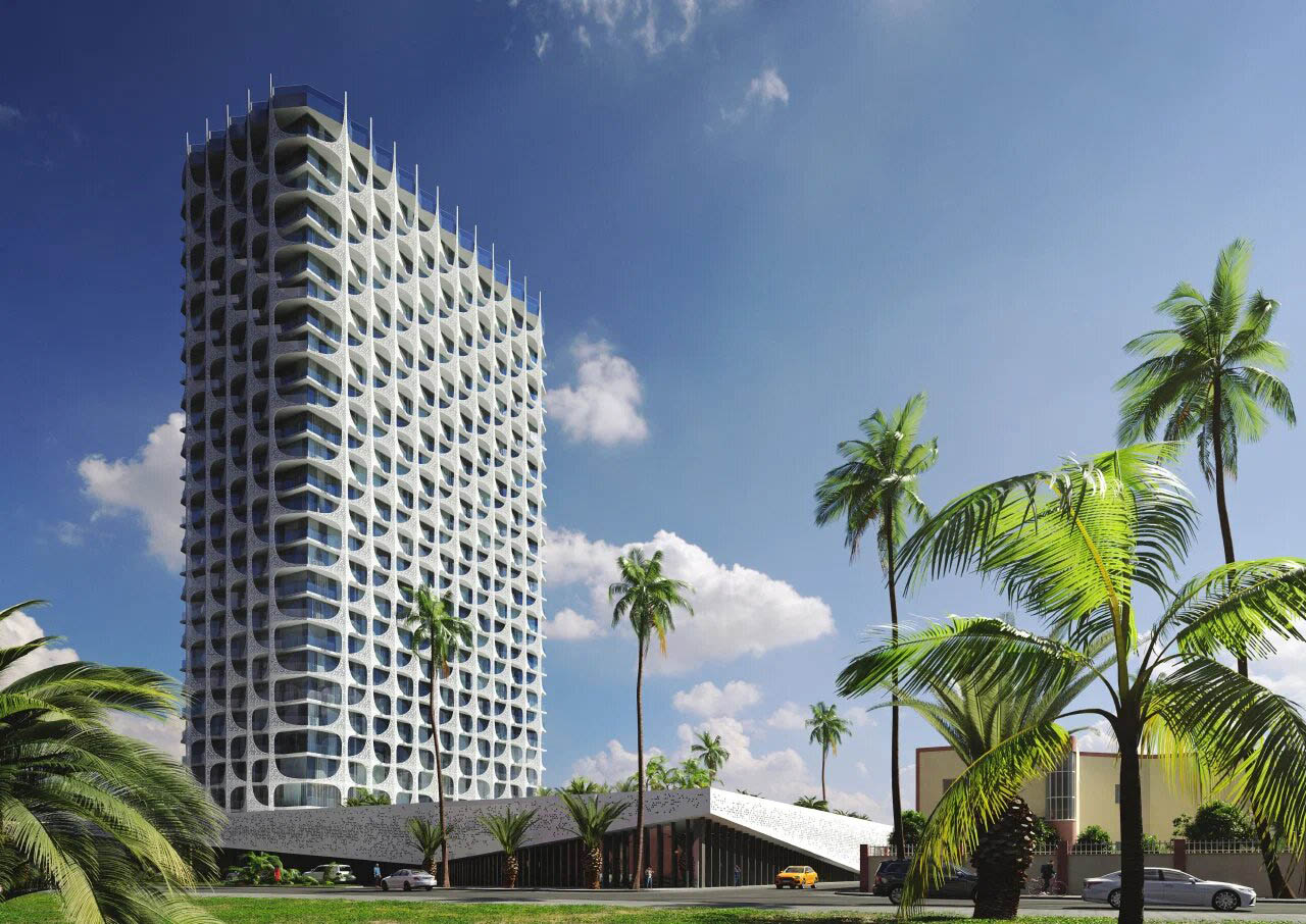 Лаконизм и подчеркнутую рациональность планировочных решений комплекса компенсирует сложно решенный декоративный фасад, представляющий собой современное прочтение традиционного арабского орнамента. Прообразом, положенным в основу разработанного специально для жилого комплекса архитектурного паттерна, стал гирих – сложное сочетание геометрических элементов и линий, образующих непрерывный, но постоянно меняющийся узор. Каждый элемент фасада выполнен из алюминиевых панелей толщиной 6 мм. Габариты элемента: 6,6 м на 4,78 м. Диаметр каждого из отверстий перфорации – 60 мм. Характер перфорации произвольно меняется от элемента к элементу, формируя в пределах фасада максимально сложный и разнообразный рисунок.